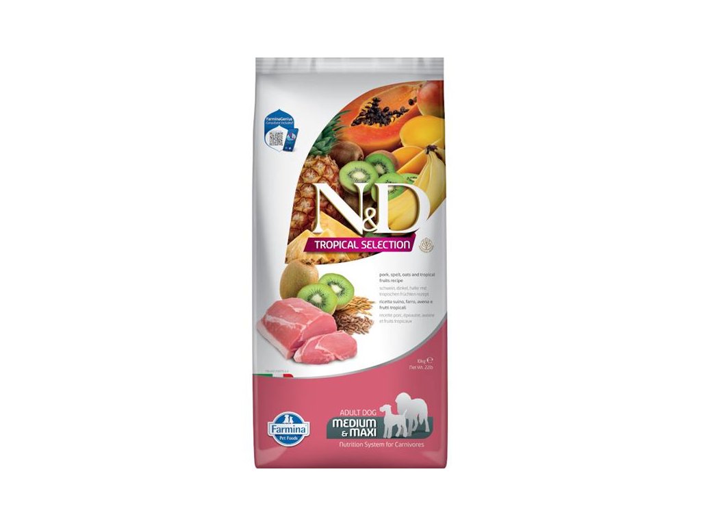 Kompletní nízkoobilné krmivo s vepřovým masem a tropickým ovocem pro dospělé psy středních a velkých plemen. Řada N&D Tropical Selection v sobě kombinuje kvalitní zdroje živočišných bílkovin, vysoce kvalitní obiloviny a chutné tropické ovoce pro nasycení vašeho zvířecího kamaráda.Granule řady Tropical Selection navazují na řadu nízkoobilných krmiv Ancestral Grain, v nichž je maso doplněno ovsem a špaldou. Tyto „staré obilniny“ se vyznačují nízkým glykemickým indexem a tím prodlužují dobu sytosti. Chutnost krmiva zvyšuje přidané tropické ovoce, jako je papája, mango, kiwi, ananas a banán, bohaté na přírodní antioxidanty a vitamíny.