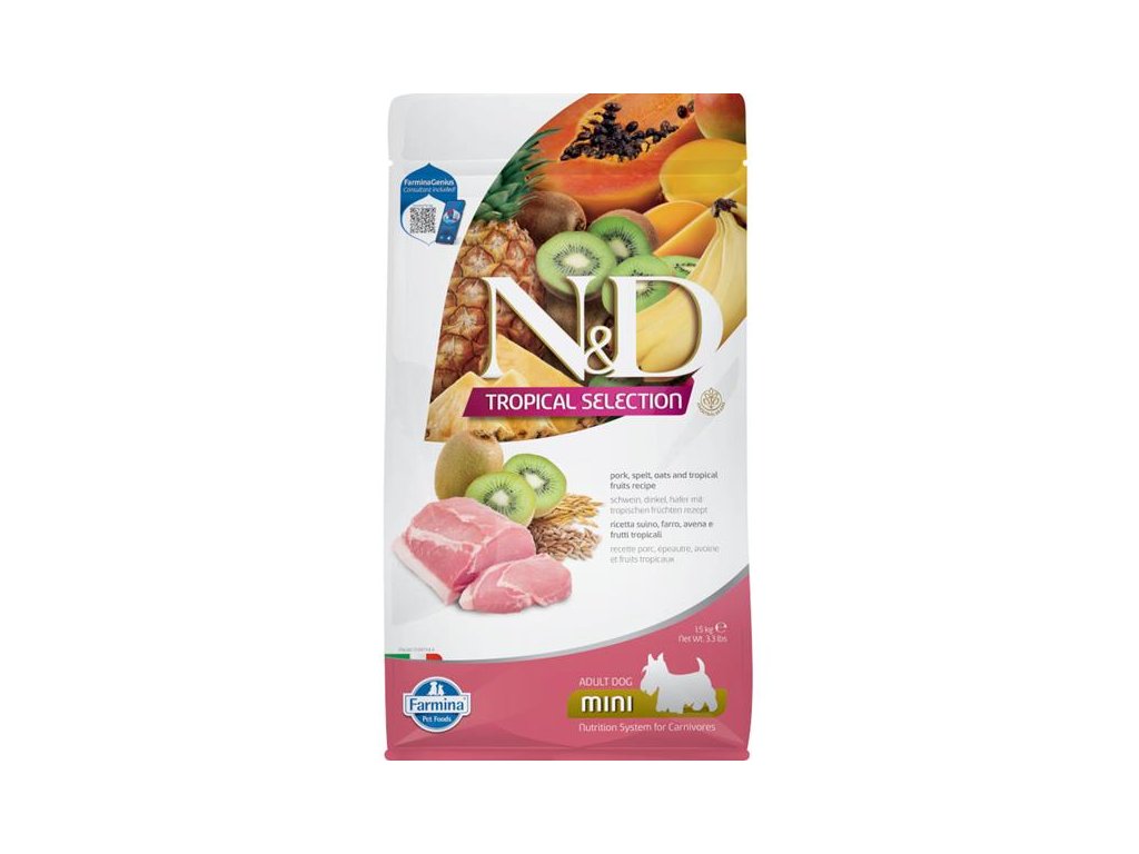 Kompletní nízkoobilné krmivo s vepřovým masem a tropickým ovocem pro dospělé psy malých plemen. Řada N&D Tropical Selection v sobě kombinuje kvalitní zdroje živočišných bílkovin, vysoce kvalitní obiloviny a chutné tropické ovoce pro nasycení vašeho zvířecího kamaráda.Granule řady Tropical Selection navazují na řadu nízkoobilných krmiv Ancestral Grain, v nichž je maso doplněno ovsem a špaldou. Tyto „staré obilniny“ se vyznačují nízkým glykemickým indexem a tím prodlužují dobu sytosti. Chutnost krmiva zvyšuje přidané tropické ovoce, jako je papája, mango, kiwi, ananas a banán, bohaté na přírodní antioxidanty a vitamíny.