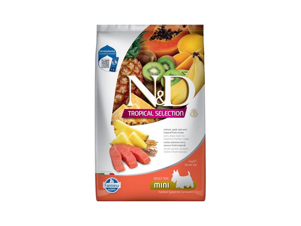 Kompletní nízkoobilné krmivo s lososem a tropickým ovocem pro dospělé psy malých plemen. Řada N&D Tropical Selection v sobě kombinuje kvalitní zdroje živočišných bílkovin, vysoce kvalitní obiloviny a chutné tropické ovoce pro nasycení vašeho zvířecího kamaráda.Granule řady Tropical Selection navazují na řadu nízkoobilných krmiv Ancestral Grain, v nichž je maso doplněno ovsem a špaldou. Tyto „staré obilniny“ se vyznačují nízkým glykemickým indexem a tím prodlužují dobu sytosti. Chutnost krmiva zvyšuje přidané tropické ovoce, jako je papája, mango, kiwi, ananas a banán, bohaté na přírodní antioxidanty a vitamíny.