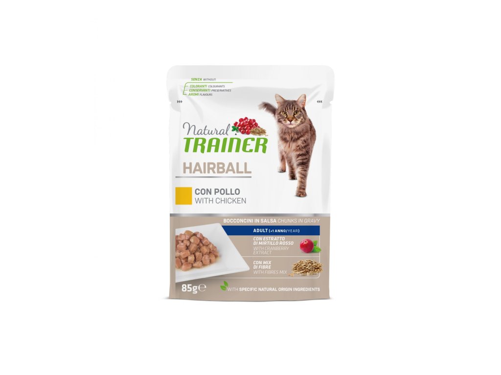 Kompletní a vyvážené krmivo pro dospělé kočky od 1 roku věku s predispozicí k tvorbě chomáčů chlupů. Dopřejte své kočce nejvyšší kvalitu v podobě lahodné kapsičky od Natural Trainer. Ingredience obsažené v kapsičce Natural Trainer jsou přírodního původu, aby vaší kočce přinesli zdravotní výhody. Bílkovinovou složkou je kuřecí maso, které je bohaté na esenciální aminokyseliny a má snížený obsah tuků a soli. Navíc je zdrojem vitaminů skupiny B, zejména thiaminu, riboflavinu, niacinu a také minerálních látek (fosfor, hořčík, železo, zinek, vápník a selen).