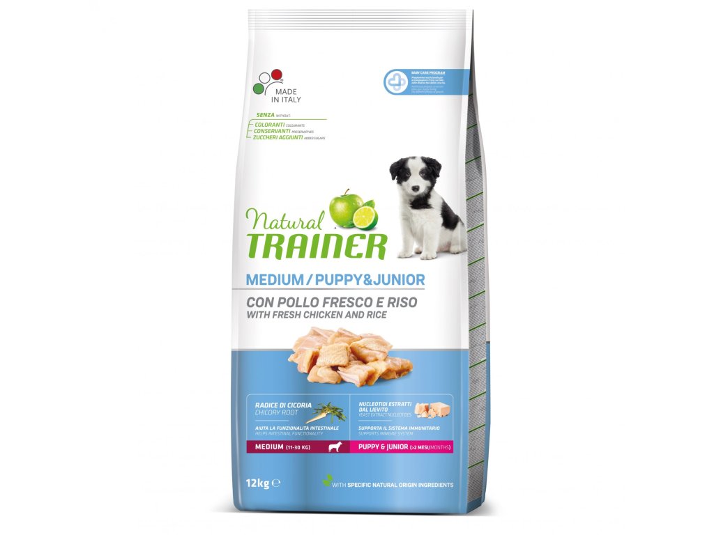 Krmivo pro štěňata a mladé psy středních plemen (11-30 kg) s obsahem kvalitního čerstvého kuřecího masa. Štěňata a mladí psi potřebují pro svůj vývoj a zdravý růst odlišné složení živin. Krmivo Trainer má nejen výbornou chuť, ale zároveň obsahuje veškeré potřebné látky a živiny. Bez přidaných barviv, umělých konzervantů a dochucovadel. S obsahem nukleotidů (extraktem z kvasnic) na posílení imunitního systému, s rozpustnou rostlinnou vlákninou a probiotiky pro zajištění správné funkce trávicího ústrojí a s extraktem z juky na kontrolu zápachu exkrementů a pro její protizánětlivé vlastnosti.