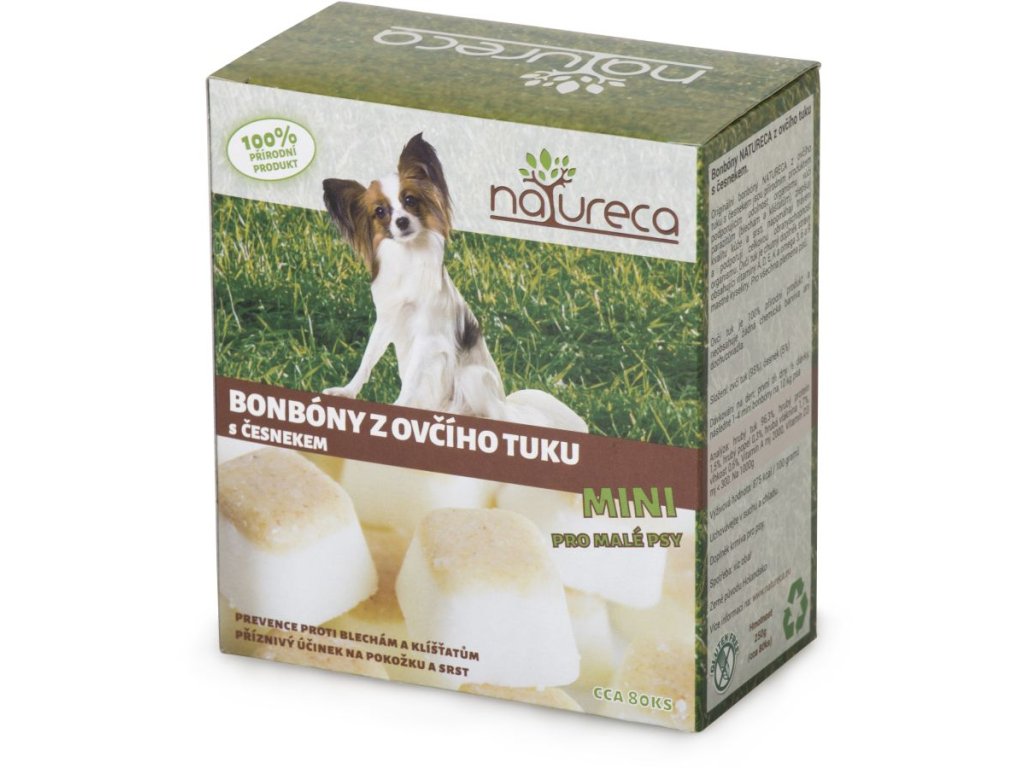 Při užívání ovčího tuku Natureca se na vašem psovi prokáže zdravější pokožka, lesklá srst, silnější kosti, lepší zdraví, vyšší odolnost a lepší střevní mikroflóra. Bonbony z ovčího tuku Natureca mohou pomoci i proti nepříjemnému vypadávání srsti psa, proti suché či šupinaté nebo podrážděné pokožce a celkově posiluje obranyschopnosti organismu. Jsou také vhodné pro psy trpící alergiemi na potraviny a také pro psy s dietou na jehněčím mase. Přídavek česneku je perfektní pro zdravé střevní prostředí.