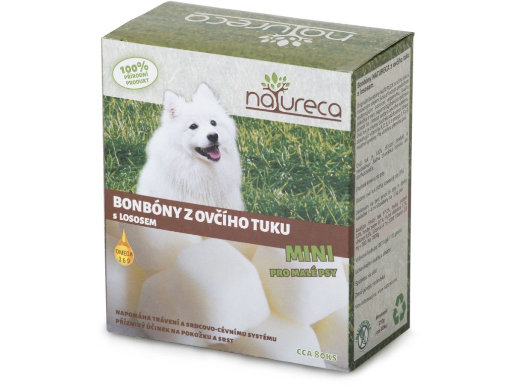 Při užívání ovčího tuku Natureca se na vašem psovi prokáže zdravější pokožka, lesklá srst, silnější kosti, lepší zdraví, vyšší odolnost a lepší střevní mikroflóra. Bonbony z ovčího tuku Natureca mohou pomoci i proti nepříjemnému vypadávání srsti psa, proti suché či šupinaté nebo podrážděné pokožce a celkově posiluje obranyschopnosti organismu. Jsou také vhodné pro psy trpící alergiemi na potraviny a také pro psy s dietou na jehněčím mase. Přídavek lososového oleje přináší důležité omega 3 a 6 mastné kyseliny.