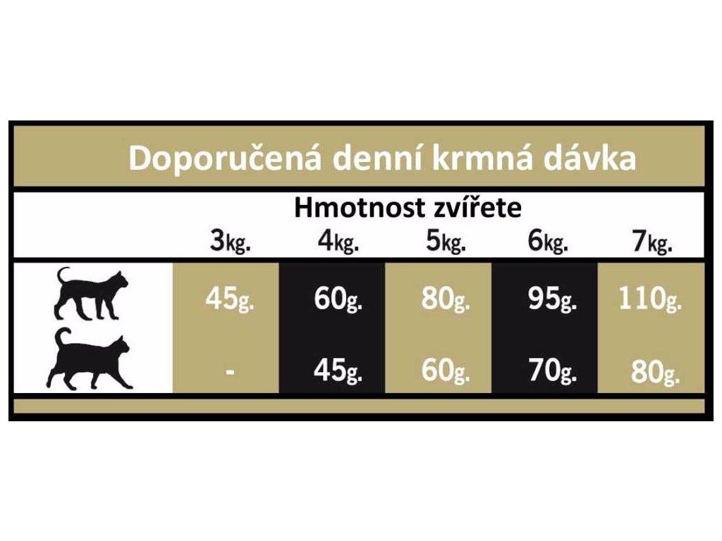 Analytické složky: Hrubý protein 32 %, hrubý olej a tuky 16 %, mastné kyseliny omega 6: 3 %, mastné kyseliny omega 3: 0,6 %, hrubá vláknina 3 %, celková dietní vláknina 7 %, hrubý popel 7 %, vápník 1,1 %, fosfor 1 %, vlhkost 9 %.