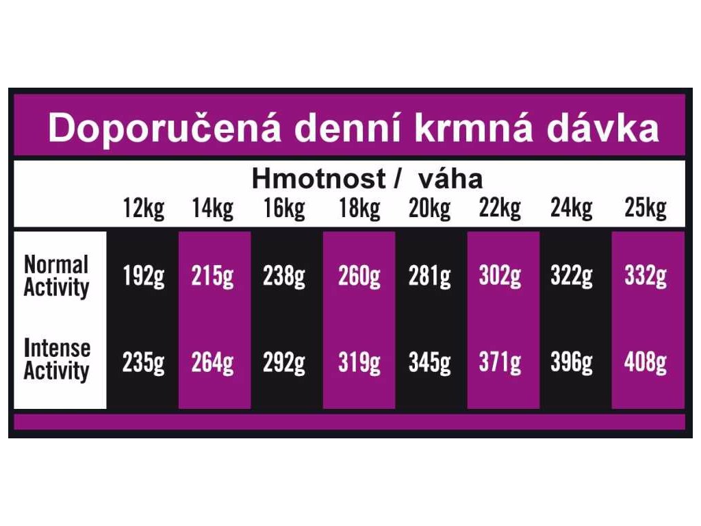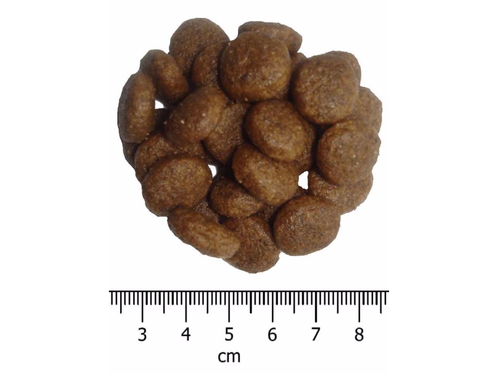 Analytické složky: Hrubý protein 26 %, hrubý olej a tuky 16 %, EPA+DHA 770 mg / kg, hrubá vláknina 2,5 %, hrubý popel 8 %, vápník 1,35 %, fosfor 0,95 %.