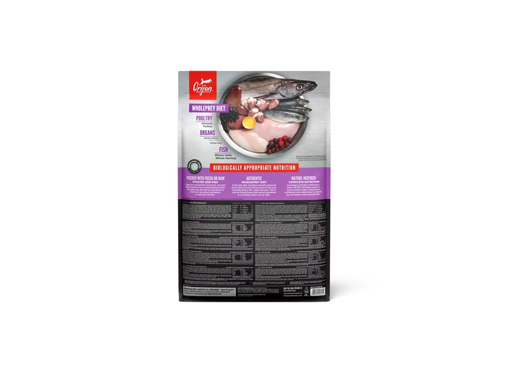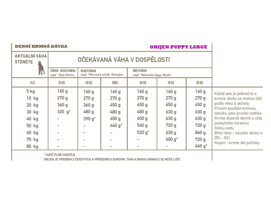 Orijen Dog Puppy Large je plný živočišných proteinů z volně chovaných kuřat a krůt, ryb lovených v přírodních vodách a vajec z hnízdních chovů. Všechny suroviny jsou dodávány čerstvé v bohatě výživném podílu Celé kořisti. Se sníženým obsahem sacharidu a nízkou glykemickou zátěží zajistí krmiva správný vývoj všech štěňat velkých plemen.