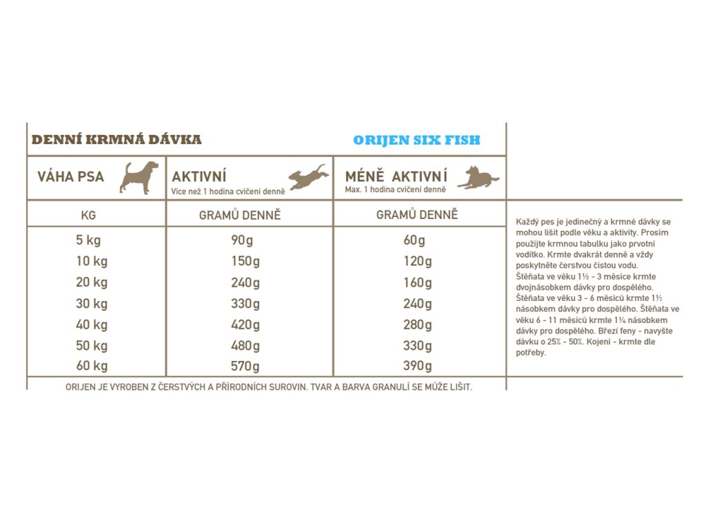 Orijen Dog 6 Fisch (6 čerstvých ryb) je kompletní, vyvážené, plnohodnotné krmivo pro psy všech plemen a všech věkových stádií s masem ze šesti druhů ryb, s bylinkami a mořskou zeleninou.
