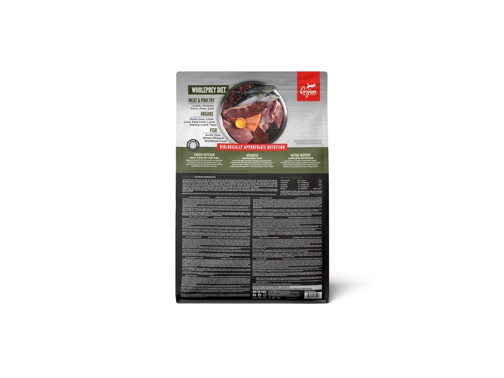 Složení: Syrové jehně (7 %), syrová zvěřina (5 %), syrová kachna (5 %), syrový siven alpský (5 %), celá syrová sardinka (5 %), syrové vepřové maso (5 %), syrová kachní játra (5 %), syrová jehněčí játra (4 %), čerstvá vejce (4 %), dehydrované jehněčí maso (4 %), dehydrovaný síh (4 %), dehydrovaná treska modravá (4 %), dehydrované skopové maso (4 %), dehydrovaný sleď (4 %), dehydrovaná makrela (4 %), syrová koza (4 %), syrová vepřová játra (4 %), celá zelená čočka, celá cizrna, celý hrách, syrový pstruh duhový (3 %), kachní tuk (3 %), celá červená čočka, celé fazole pinto, vláknina z čočky, olej z tresky (1 %), celé fazole navy, hráškový škrob, syrové jehněčí ledviny (0,5 %), syrové jehněčí dršťky (0,5 %), sušená řasa, celá čerstvá dýně, čerstvá celá máslová dýně, čerstvá celá cuketa, čerstvá celá mrkev, celá čerstvá jablka , čerstvé celé hrušky, sušený kořen čekanky, čerstvá kapusta, čerstvý špenát, čerstvé listy červené řepy, čerstvé listy tuřínu, celé brusinky, celé borůvky, celé plody muchovníku, kurkuma, ostropestřec, kořen lopuchu, levandule, kořen ibišku, šípky.