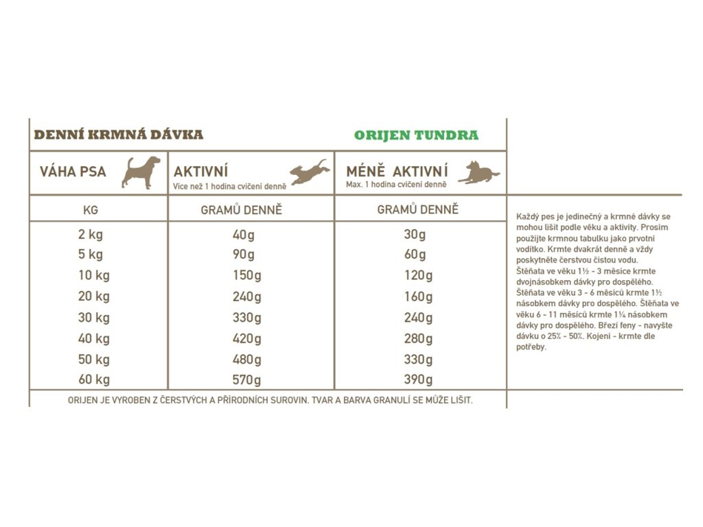 Orijen Dog Tundra je krmivo vhodné pro psy všech plemen i věku. Obsahuje maso z burských koz, kanců, sivenů, zvěřiny nebo divokých kachen a ovcí. Vysoká dávka rozmanitých bílkovin s jedinečnou chutí.