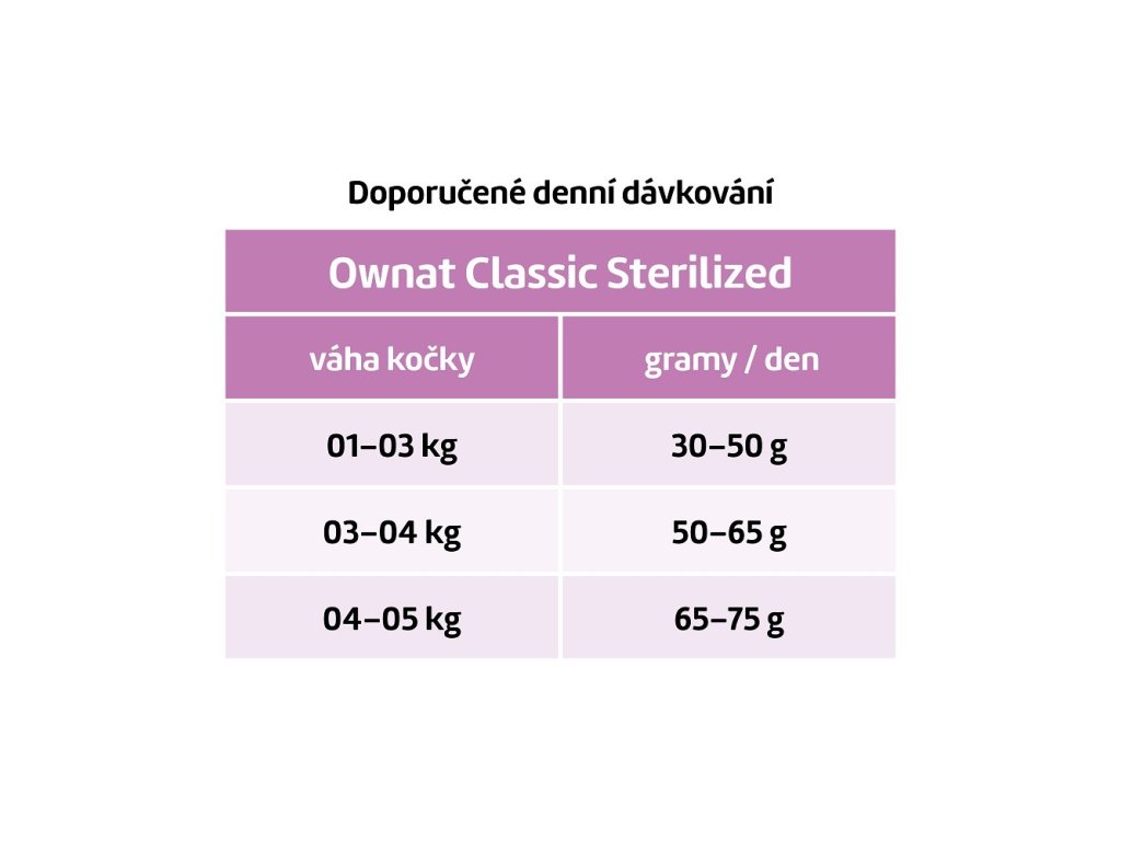 OWNAT CLASSIC CAT Sterilized je krmivo určené pro sterilizované kočky, které mají nižší energetické nároky a větší sklon k přibírání na váze. Toto krmivo obsahuje nižší podíl tuku a je bohaté na kvalitní bílkoviny z kuřecího masa, které pomáhají udržovat zdravou svalovou hmotu. Přidané brusinky podporují zdraví močového ústrojí, což je častá potřeba sterilizovaných koček.