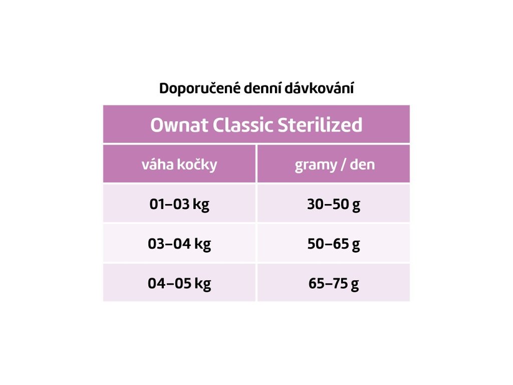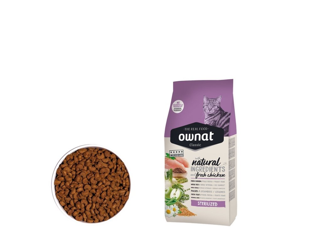 OWNAT CLASSIC CAT Sterilized je krmivo určené pro sterilizované kočky, které mají nižší energetické nároky a větší sklon k přibírání na váze. Toto krmivo obsahuje nižší podíl tuku a je bohaté na kvalitní bílkoviny z kuřecího masa, které pomáhají udržovat zdravou svalovou hmotu. Přidané brusinky podporují zdraví močového ústrojí, což je častá potřeba sterilizovaných koček.