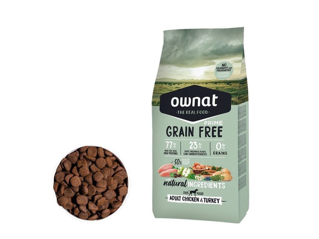 OWNAT GF PRIME DOG Adult Chicken & Turkey je ideální volbou pro majitele dospělých psů, kteří chtějí svým mazlíčkům nabídnout chutnou a výživnou stravu bez obilovin.