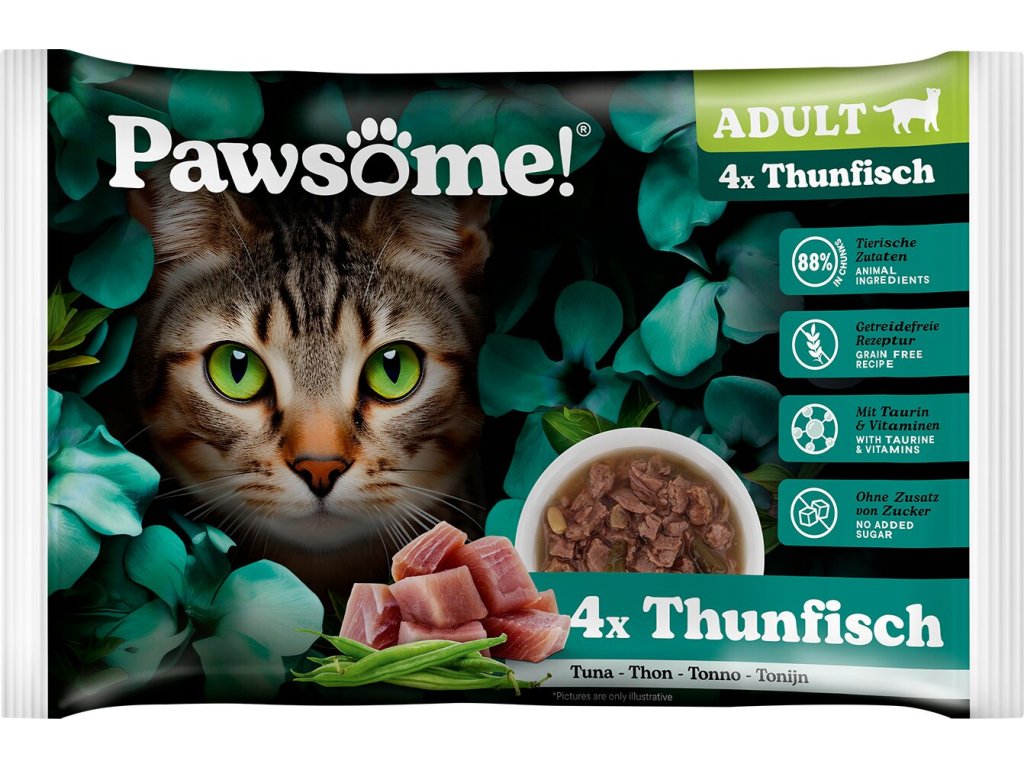 Složení: maso a vedlejší výrobky živočišného původu (kousky masa 76 %, z toho kuřecí maso 14 %), ryby a vedlejší produkty z ryb (kousky tuňáka 12 %), minerální látky, hrachový škrob, lignocelulóza, hrachová bílkovina, zelené fazole 0,45 %, čekankový inulin 0,4 %, slunečnicový olej