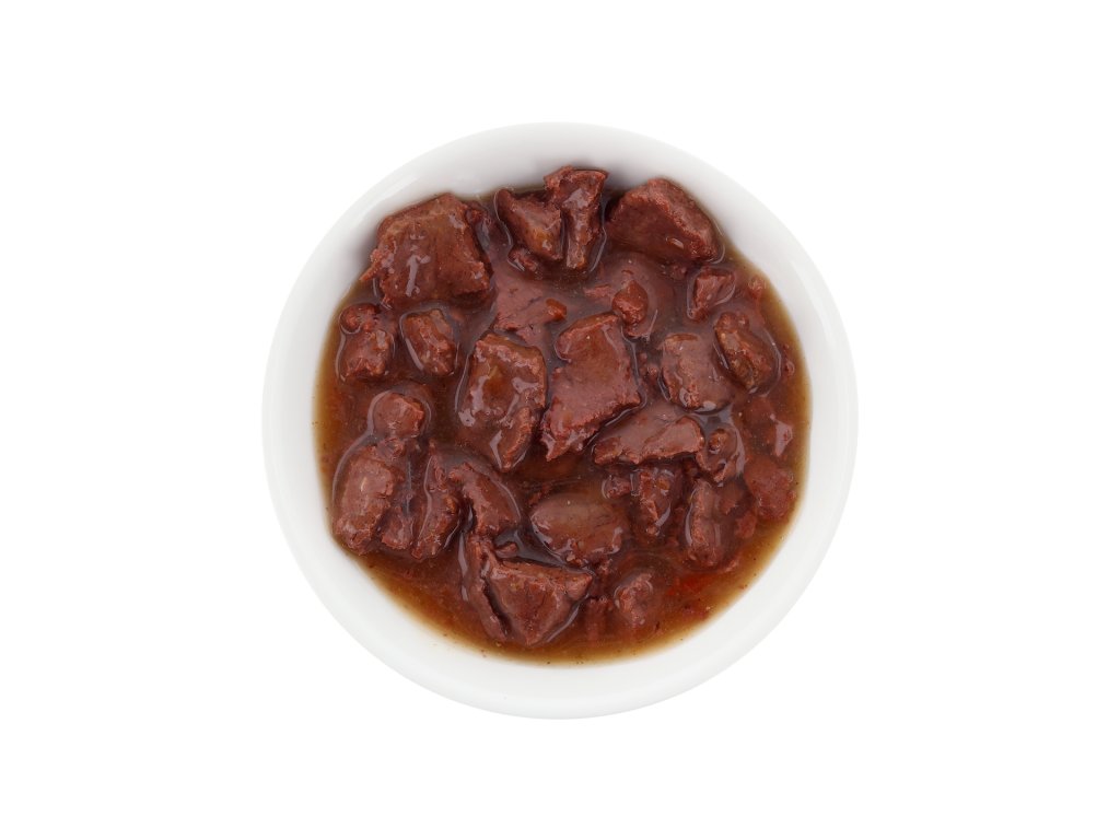 Složení: maso a vedlejší výrobky živočišného původu (kousky masa 88 %, z toho hovězí maso 40,6 %), minerální látky, hrachový škrob, hrachová bílkovina, rajčata 0,45 % (sušená), inulin z čekanky 0,4 %, lignocelulóza, rozmarýn 0,025 %