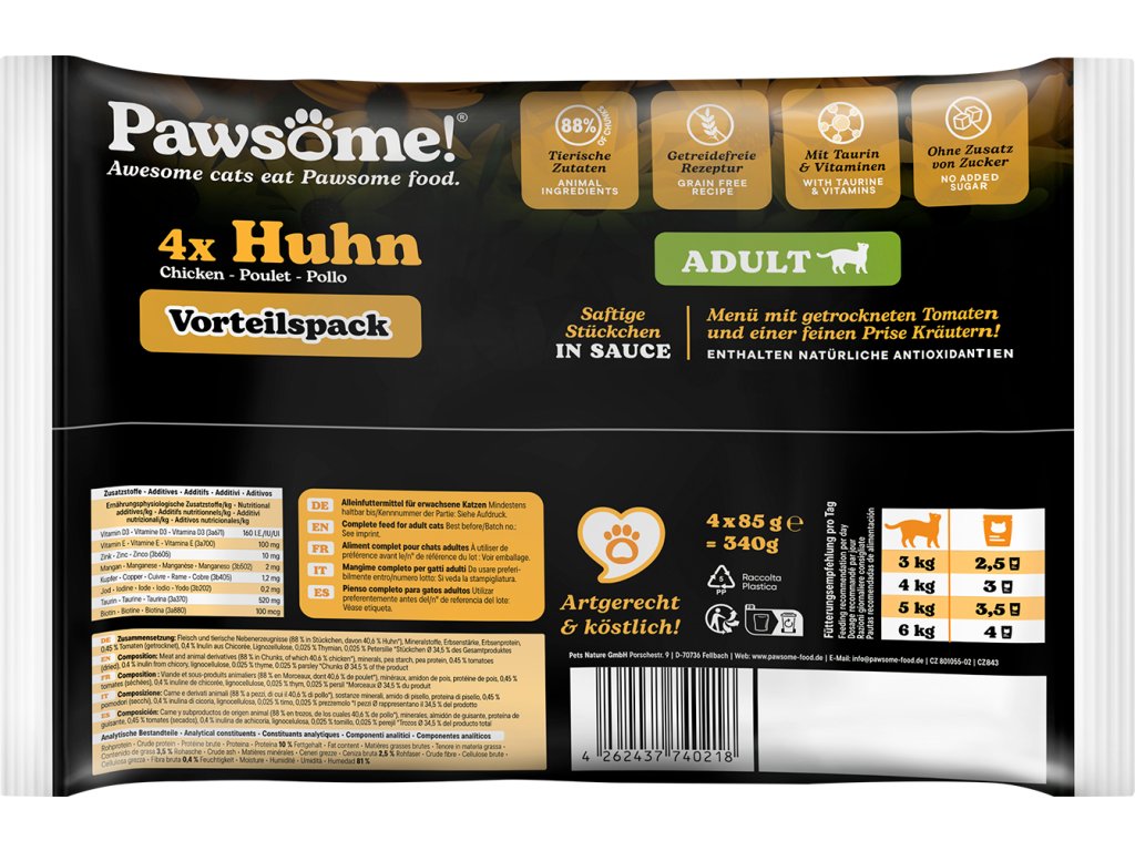 Krmivo Pawsome! je obohaceno o taurin, který přispívá k udržení zdravého zraku a normální činnosti srdce. Kočky si nedokáží taurin vytvářet samy, a proto je důležité nabídnout jim stravu, která jim tuto důležitou aminokyselinu poskytne.