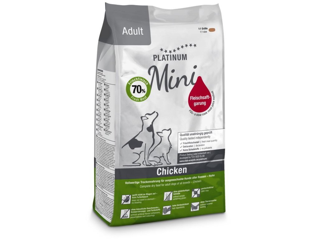 Platinum Natural Mini Adult s kuřecím masem je superprémiové krmivo vhodné pro dospělé psy malých plemen. Díky svému přírodnímu a jednoduchému složení je snadno stravitelné. Krmivo je obohaceno o hodnotné oleje, výtažky z bylinek, rýži, zeleninu, vitamíny (včetně vitamínu K1) a stopové prvky. Vyhovuje nutričním požadavkům dospělých a aktivních psů.