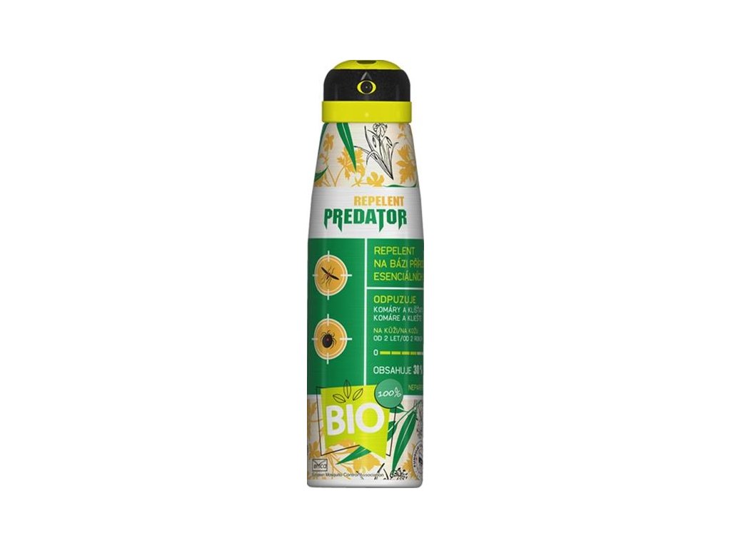 Repelent Predator BIO sprej je repelent v aerosolovém provedení na bázi přírodních esenciálních silic - v biokvalitě. Díky vysokému podílu účinných látek je docíleno optimálního účinku proti veškerým druhům komárů i klíšťat. repelent se zvýšeným obsahem účinných látek na bázi přírodních esenciálních silic vhodný k aplikaci na kůži a oděv pro děti od 2 let bez parfemace s přirozenou citrusovou vůní doba účinnosti minimálně 3,5 hodiny vhodný i pro domácí mazlíčky 100 % dávkování ve svislé i vodorovné poloze Použití: Před použitím důkladně protřepejte. Aplikujte ze vzdálenosti 20-30 cm na pokožku a oděv. Při použití na tvář a krk nastříkejte přípravek do dlaní a poté ho rozetřete. Složení: eucalyptus citriodora (CAS: 1245629-80-4, ES: 800-429-0) 300 g/kg. Obsahuje: (hnací plyn), propan, butan. Dávkování: Používejte biocidy bezpečně. Před použitím si přečtěte údaje na obalu. Repelent je účinný proti komárům minimálně po dobu 4 hodin a na klíšťata 2 hodiny. Nepoužívejte u dětí do 2 let. Při přímé aplikaci na pokožku dětí od 2 do 12 let je možné přípravek aplikovat max. 1 x denně. U dětí starších 12 let a dospělých max. 2 x denně. Max. denní dávka na dospělého člověka je 12 g. Neaplikujte na nadměrně opálenou nebo porušenou pokožku. Při podráždění kůže přerušte používání. Skladujte přípravek odděleně od potravin, nápojů a krmiv. Přípravek není vhodný pro průmyslové použití a profesionální uživatele. Zamezte styku přípravku s očima a ústy. U dětí neaplikujte přípravek přímo na dlaně a prsty. Po skončení expozice umyjte ošetřená místa mýdlem a vodou. Telefonní číslo pro naléhavé situace: Toxikologické informační středisko, Na Bojišti 1, 128 08 Praha 2 (nepřetržitě) tel.: +420 224 919 293, +420 224 915 402.