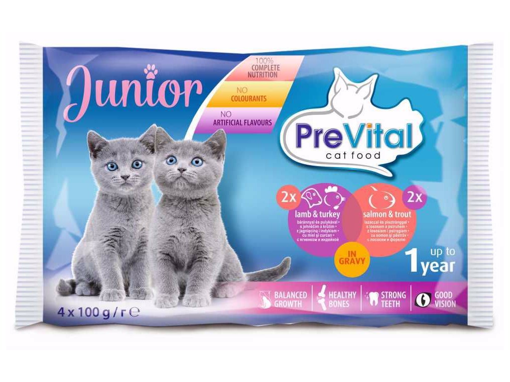PreVital Cat Junior jehněčí krůtí losos pstruh v omáčce 4 x 0,1 kg