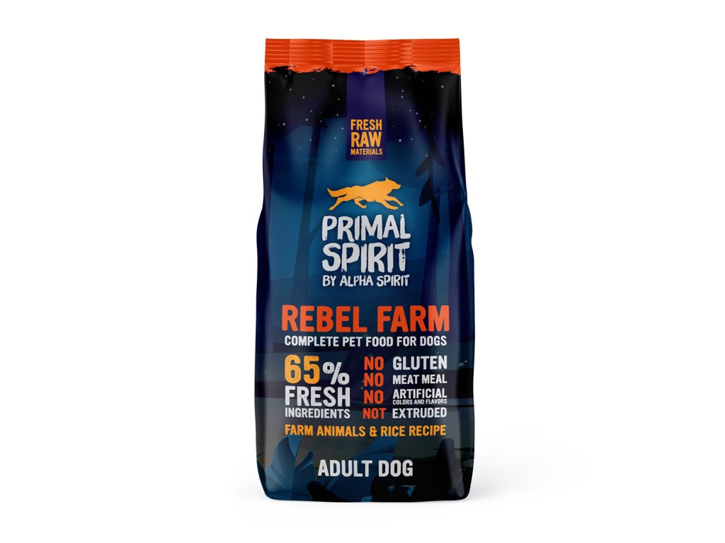 Primal Spirit Dog 65% Rebel Farm jsou za studena lisované granule pro dospělé psy všech plemen s vysokým obsahem kuřecího masa z volného chovu doplněné o hydrolyzovanou rýži, ovoce a zeleninu. Krmivo s nízkým obsahem obilovin. Bez obsahu lepku, bez GMO, bez masokostní moučky, bez umělých konzervantů, dochucovadel a barviv, bez extrudace.