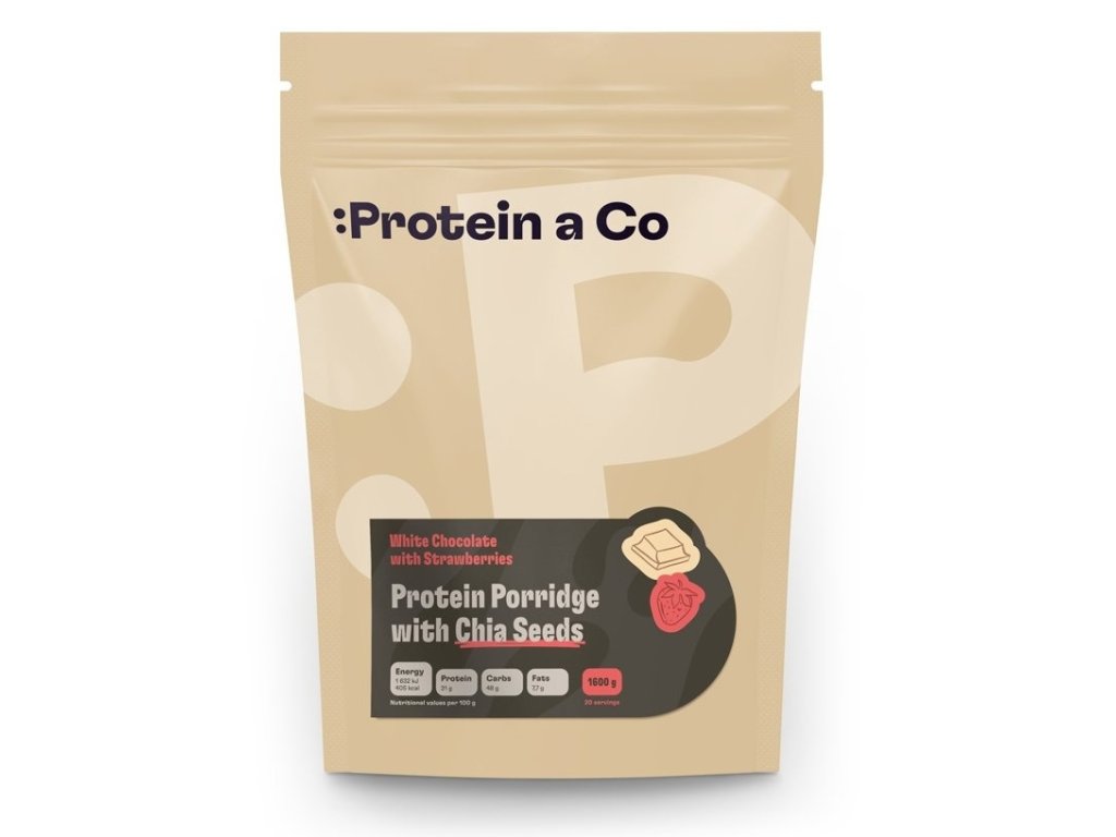 Složení: ovesné vločky (min. 35 %), 80% syrovátkový koncentrát (min. 25 %), chia semínka (min. 3 %), jahodový prášek (min. 5 %), BIO kokosový cukr, sušené mléko, bílá čokoláda (min. 4 %)