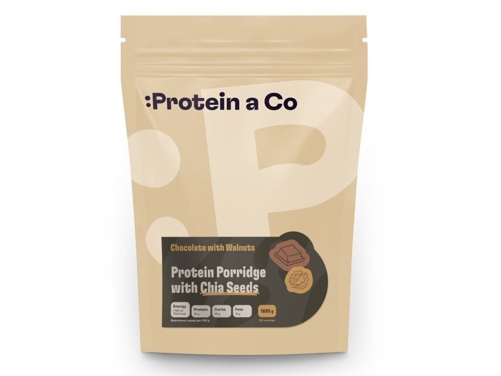 Složení: ovesné vločky (min. 35 %), 80 % syrovátkový koncentrát (min. 25 %), chia semínka (min. 3 %), kakao (min. 1 %), BIO kokosový cukr, sušené mléko, vlašské Vyberte si ořechy od značky Protein & Co.ořechy (min. 4 %)