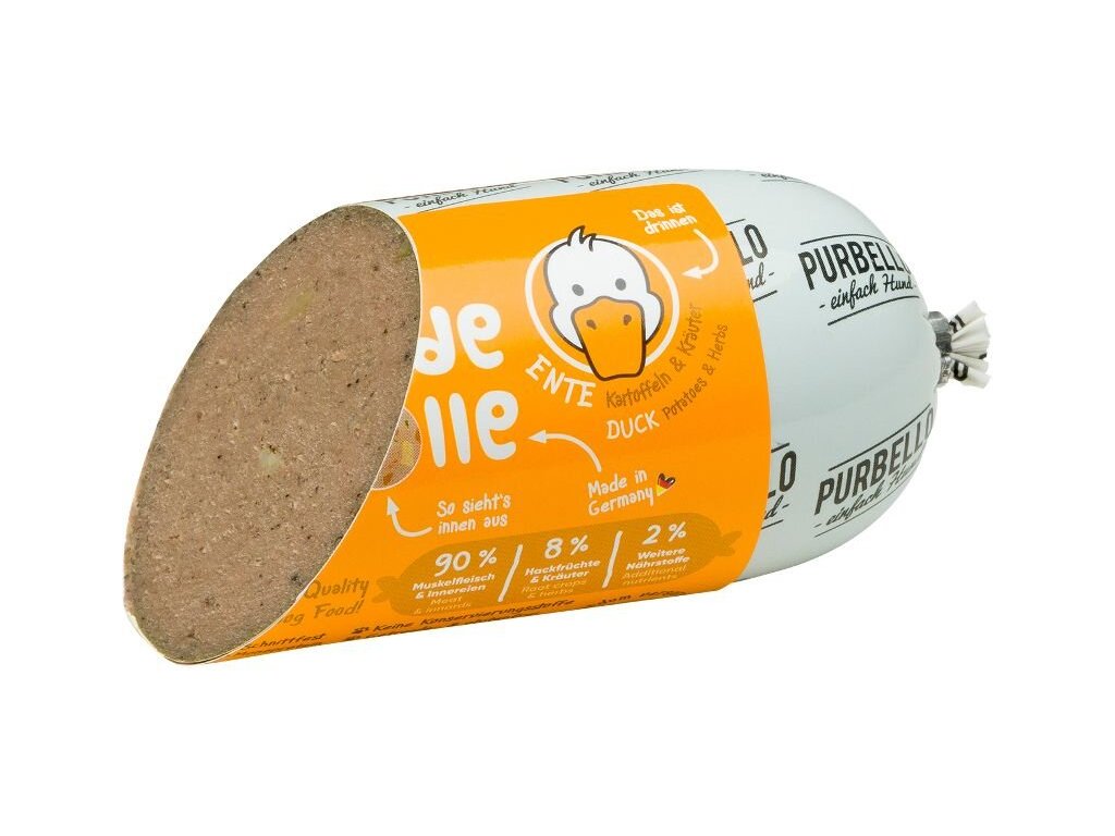 Zdravý a chutný masový salám, který obsahuje 90 % čerstvého kachního masa, brambory a bylinky.