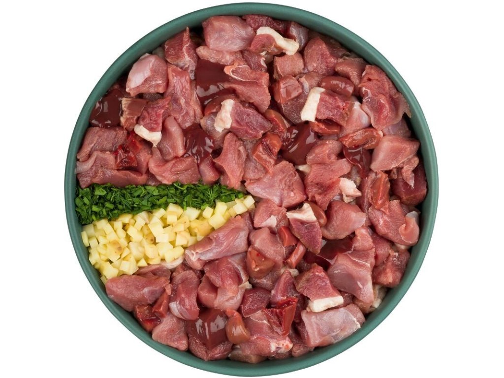 Složení: kachní maso a kachní vnitřnosti 90%, brambory 5,5%, bylinky 2,5%, minerály 1%, vápenec 1%