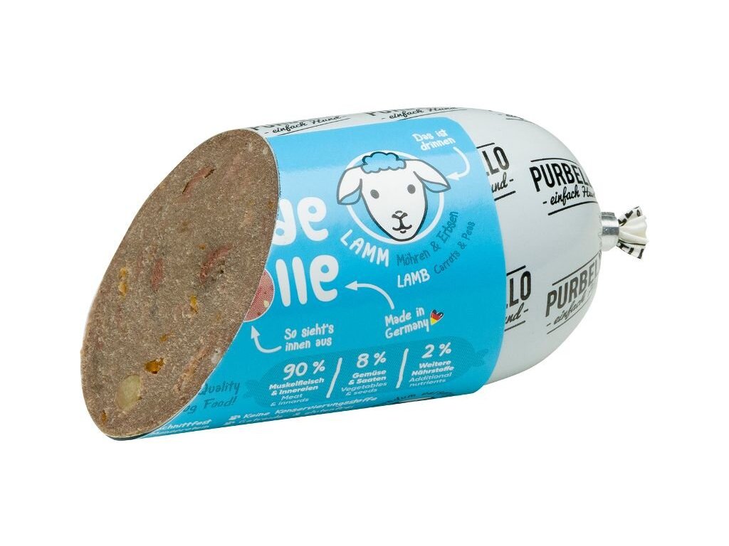Zdravý a chutný masový salám, který obsahuje 90 % čerstvého jehněčího masa, mrkev, hrášek a lněné semínko.