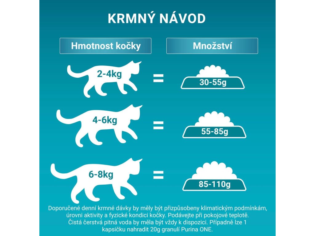 Viz tabulka. Objevte také vysoce kvalitní výživu v kapsičkách Purina ONE - lahodné receptury vyvinuté pro specifické potřeby vaší kočky.Doporučené denní krmné dávky by měly být přizpůsobeny klimatickým podmínkám, úrovni aktivity a fyzické kondici kočky. Čistá čerstvá pitná voda by měla být vždy k dispozici.