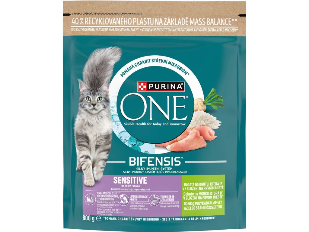 PURINA ONE® Sensitive je receptura speciálně navržená pro kočky s citlivým zažíváním a sníženou chutí k jídlu. Pro zdraví vaší kočky je nezbytný vyvážený střevní mikrobiom. Ten má přímý dopad na její imunitní systém. Mikrobiom je tvořen biliony mikroorganismů, které žijí ve střevech a jsou pro každou kočku unikátní. Rovnováha mikroorganismů je důležitá pro dobré zažívání a má pozitivní vliv na imunitní systém a celkovou pohodu vaší kočky.