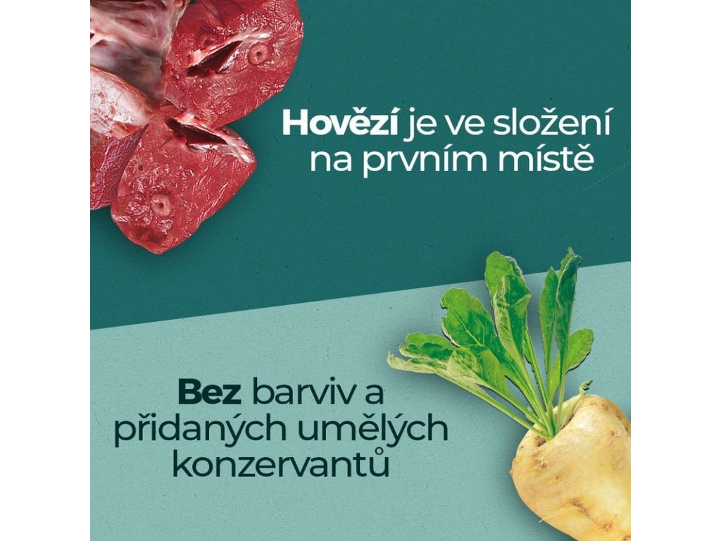 Hovězí (17 %), sušené drůbeží bílkoviny, celozrnná pšenice*, kukuřice*, kukuřičná lepková moučka, sójová moučka, živočišný tuk, pšeničná lepková moučka, sušený čekankový kořen*, minerální látky, sušené vepřové bílkoviny, dochucovací masové výtažky, kvasnice*, celulóza, spirulina (0,2 %)*, xylóza.