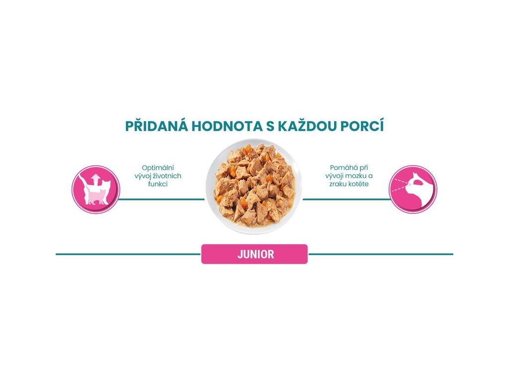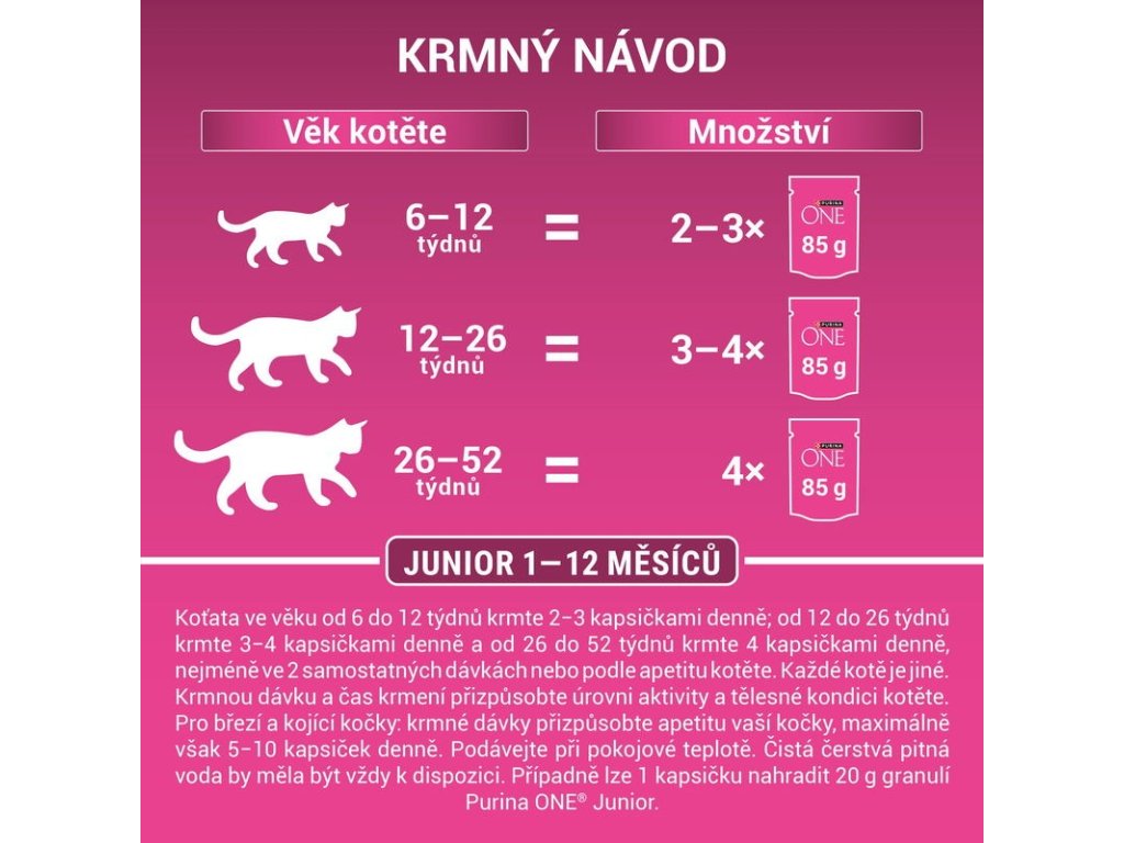 Krmivo by mělo být rozděleno alespoň do 2 jídel. Každé kotě je jiné a v závislosti na úrovni aktivity a tělesné kondici, může být nutné upravit množství potravy a/nebo čas krmení. Pro březí nebo kojící kočky: krmte tolik, kolik Vaše kočka sní, pomocí 5-10 kapsiček. Podávejte při pokojové teplotě. Dbejte na to, aby měla Vaše kočka neustále k dispozici čerstvou vodu.