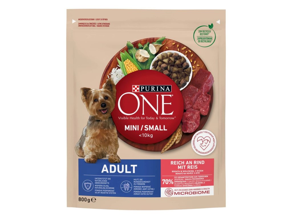 Složení: sušené drůbeží bílkoviny, pšenice (17,5 %), kukuřice (16,5 %), hovězí vnitřnosti (14,0 %), živočišné tuky, rýže (4,0 %), dochucovací masové výtažky, sójová mouka, sušená dužina cukrové řepy (3,0 %), glycerol, minerální látky, kukuřičná krupice.Nutriční doplňkové látky: m.j./kg: vitamín A: 36 000, vitamín D3: 1 100, vitamín E: 500, mg/kg: vitamín C: 140, síran železnatý monohydrát: (Fe:) 130, jodičnan vápenatý bezvodý: (I:) 2,1, síran měďnatý pentahydrát: (Cu:) 14, síran manganatý monohydrát: (Mn:) 50, síran zinečnatý monohydrát: (Zn:) 120, seleničitan sodný: (Se:) 0,15, Antioxidanty.Krmný návod: pokud podáváte krmivo Purina One poprvé, doporučujeme jej zavádět postupným přidáváním stále většího množství Purina One do stávajícího krmiva po dobu 7 dnů, aby se trávicí systém vašeho psa snáze přizpůsobil změně. Purina One Mini/Small Adult granule je možné kombinovat s kapsičkami Purina One Mini/Small Adult.