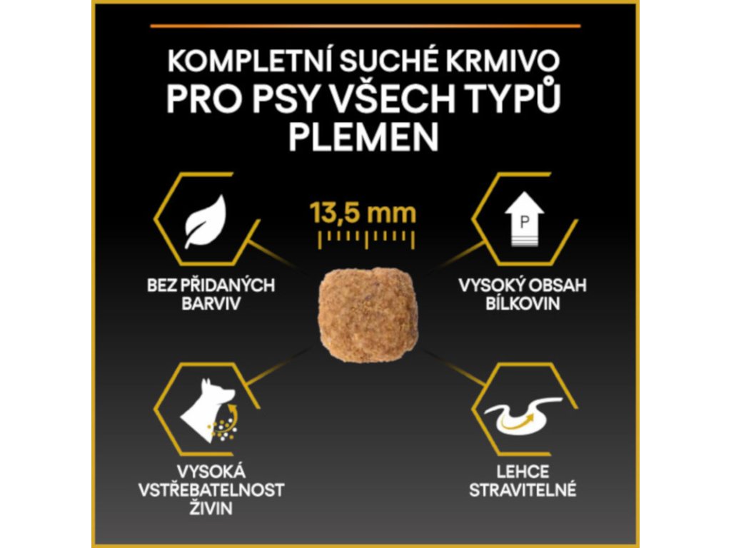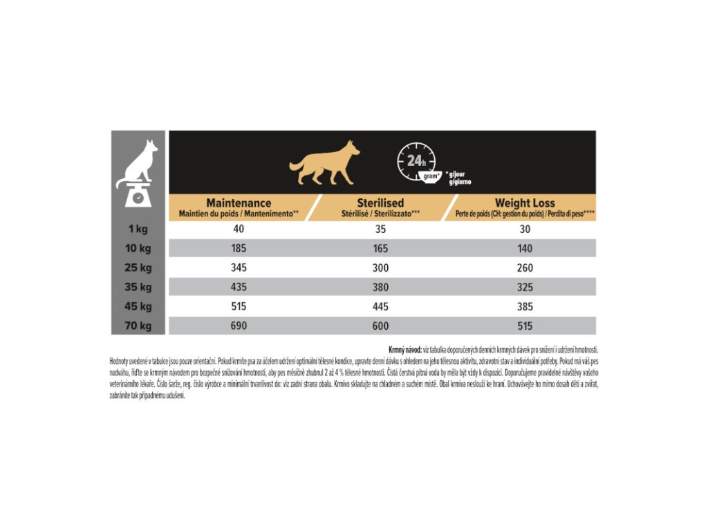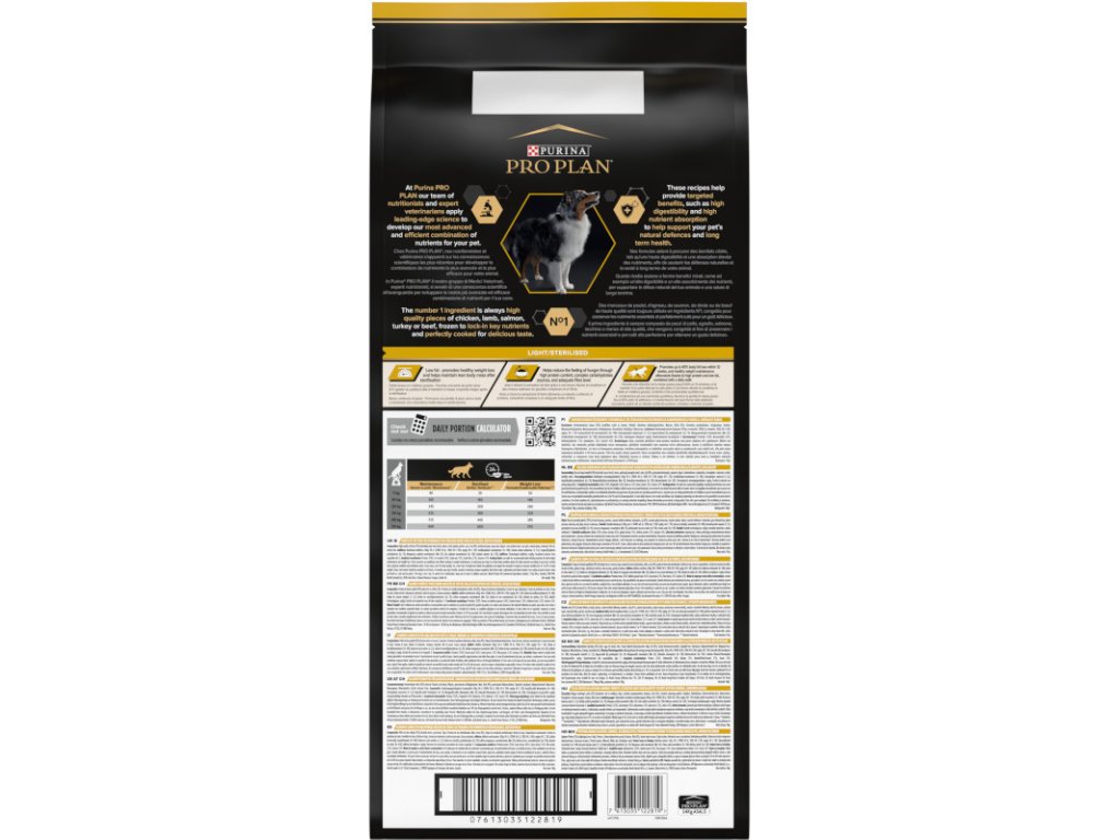 Pro Plan All Sizes Adult Light/Sterilised je kompletní krmivo s kuřecím masem pro dospělé psy všech plemen, kteří jsou náchylnější k přibírání na váze v důsledku snížené aktivity nebo kastrace. Správným dávkováním lze docílit snížení hmotnosti a zabránění vzniku nadváhy. Granule Pro Plan s kvalitním kuřecím snižují pocit hladu a napomáhají udržet ideální hmotnost díky vysokému obsahu bílkovin, sníženému podílu tuku a dostatku vlákniny. Vitamín D, minerální látky a omega-3 mastné kyseliny se postarají o zdraví zoubků a dásní.