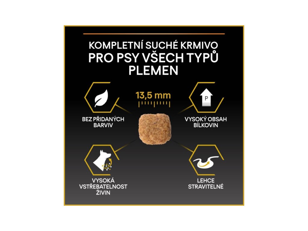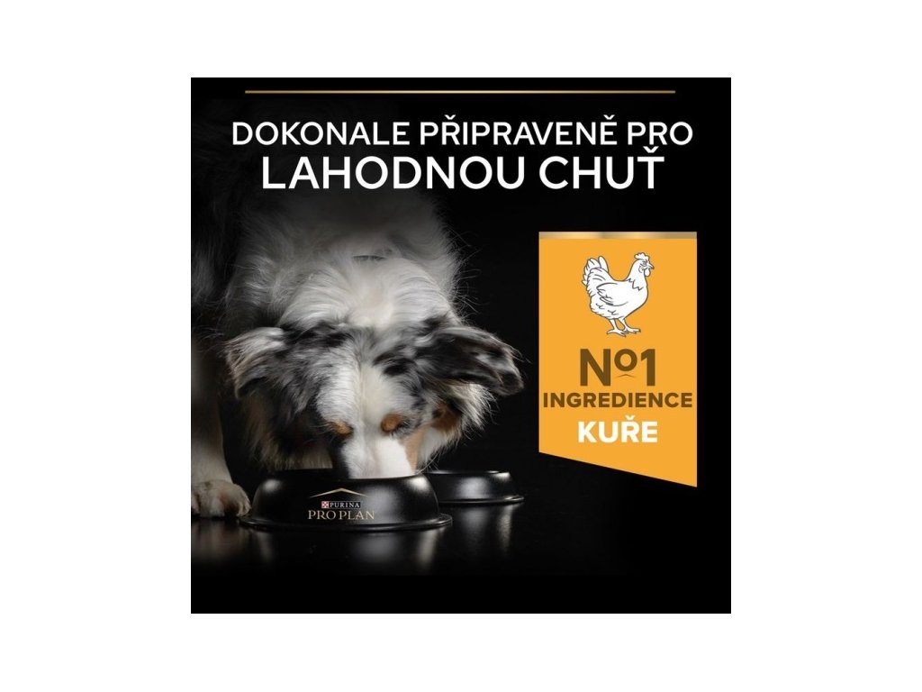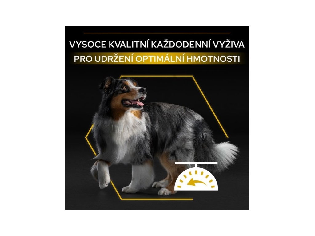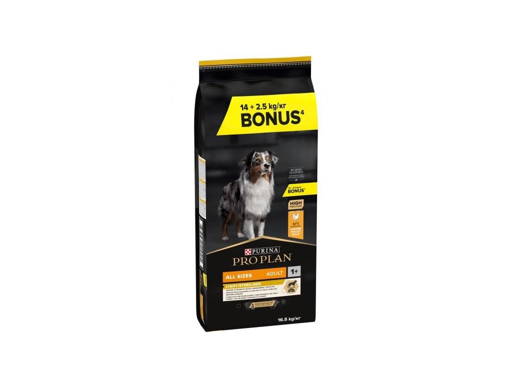 Pro Plan All Sizes Adult Light/Sterilised je kompletní krmivo s kuřecím masem pro dospělé psy všech plemen, kteří jsou náchylnější k přibírání na váze v důsledku snížené aktivity nebo kastrace. Správným dávkováním lze docílit snížení hmotnosti a zabránění vzniku nadváhy. Granule Pro Plan s kvalitním kuřecím snižují pocit hladu a napomáhají udržet ideální hmotnost díky vysokému obsahu bílkovin, sníženému podílu tuku a dostatku vlákniny. Vitamín D, minerální látky a omega-3 mastné kyseliny se postarají o zdraví zoubků a dásní.