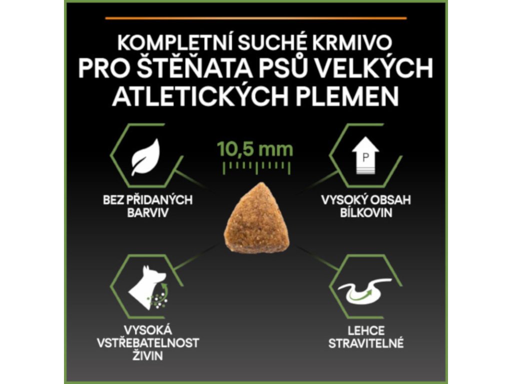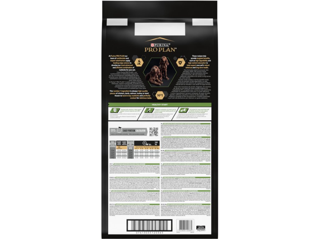 Krmivo Purina PRO PLAN® Healthy Start LARGE PUPPY ATHLETIC je vhodné pro štěňata velkých sportovních plemen (s hmotností více než 25 kg v dospělosti). Tyto granule pro štěňata obsahují vitamín D, minerální látky a specifické množství omega-3 mastných kyselin (0,3 %), které přispívají ke zdraví zubů a dásní. Krmivo má vysoký podíl kvalitního kuřecího, a tak zajišťuje optimální výživu pro rostoucí štěňata velkých plemen. To vše až do věku 24 měsíců, kdy přejdou na produkty řady ADULT.