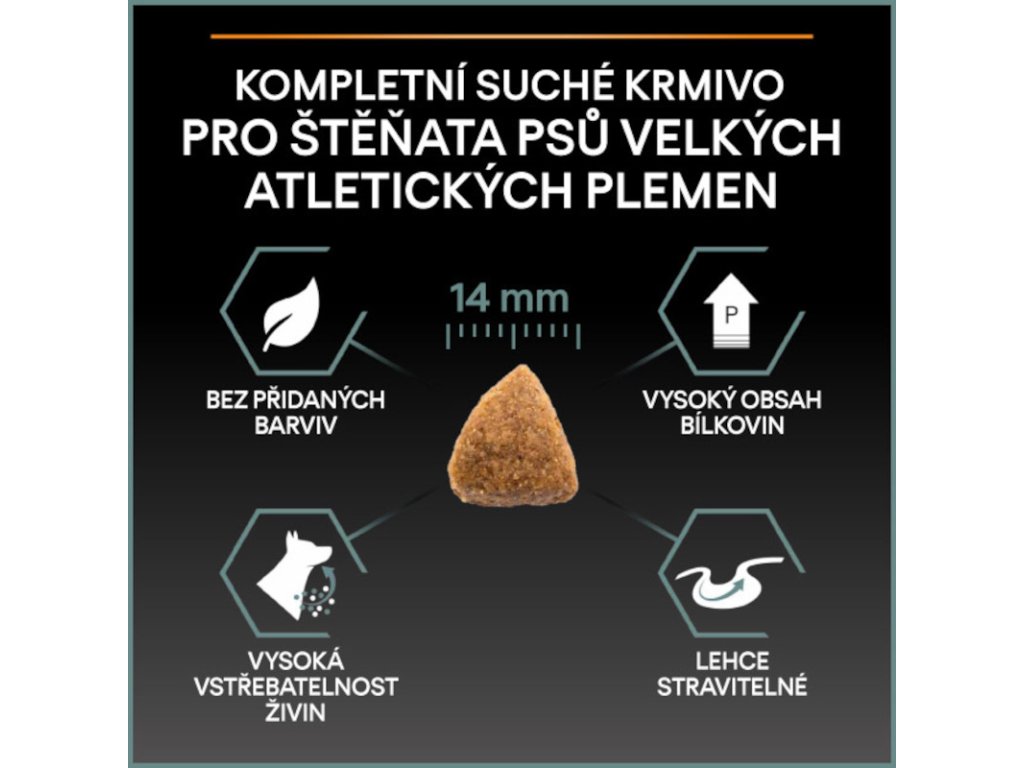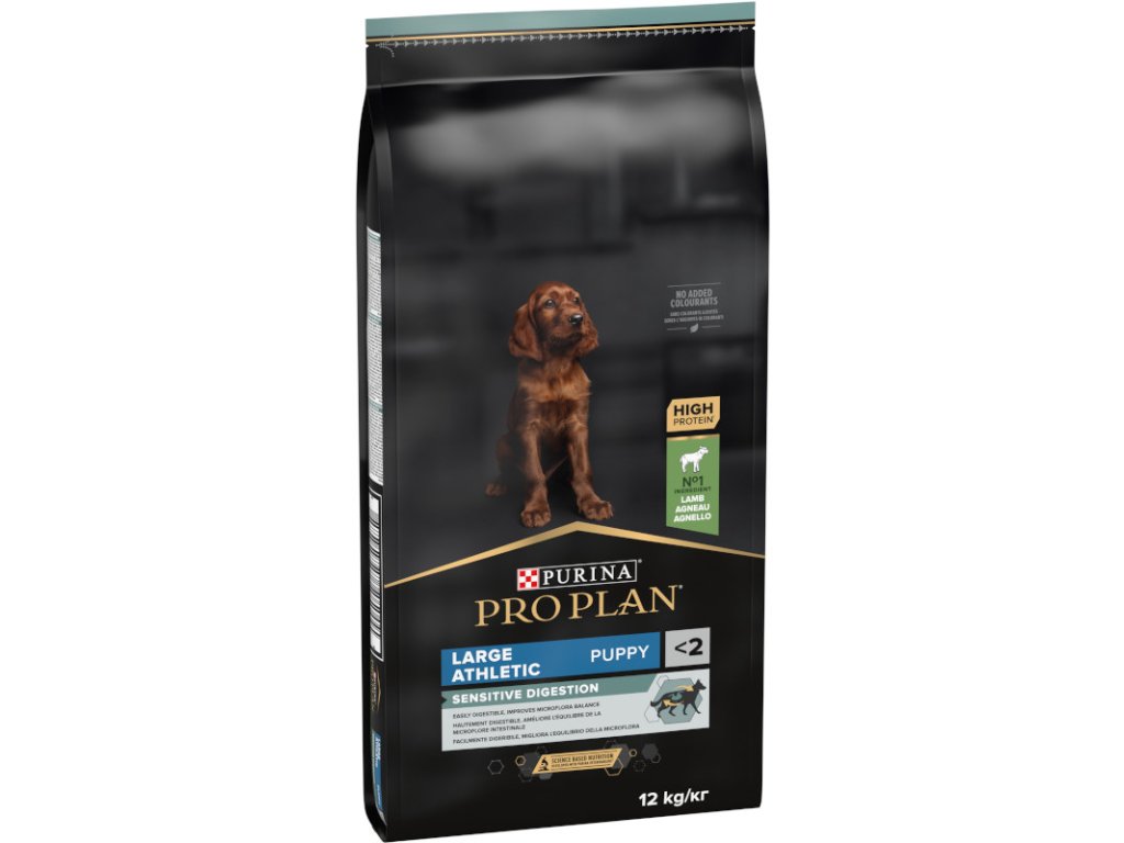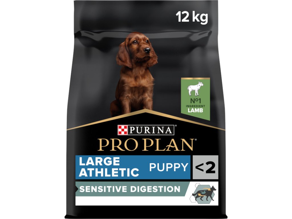 Krmivo Purina PRO PLAN® Sensitive Digestion LARGE PUPPY ATHLETIC bylo vyvinuto pro štěňata velkých sportovních plemen (s hmotností v dospělosti nad 25 kg). Granule pro štěňata obsahují vitamín D a minerální látky, které podporují silné a zdravé zuby. Krmivo má velký podíl vysoce kvalitního jehněčího, a tak zajišťuje optimální výživu štěňat velkých psů. To vše až do věku 24 měsíců, kdy přejdou na produkty řady ADULT.