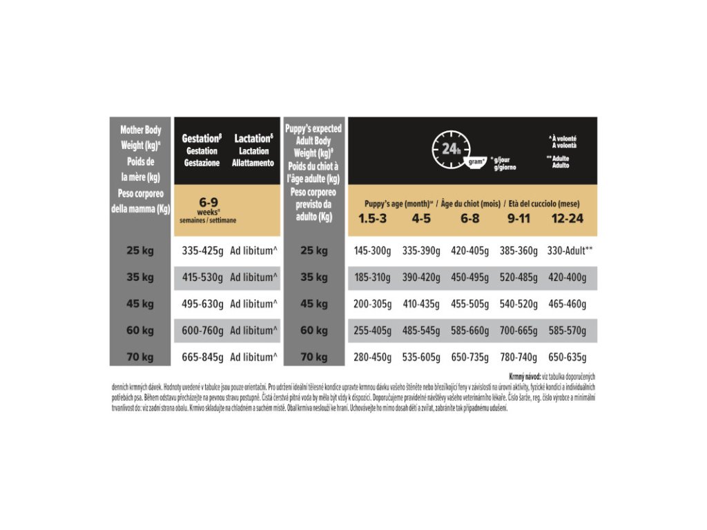 Krmný návod: viz tabulka doporučených denních krmných dávek. Hodnoty uvedené v tabulce jsou pouze orientační. Pro udržení ideální tělesné kondice upravte krmnou dávku vašeho štěněte nebo březí/kojící feny v závislosti na úrovni aktivity, fyzické kondici a individuálních potřebách psa. Během odstavu přecházejte na pevnou stravu postupně. Čistá čerstvá pitná voda by měla být vždy k dispozici. Doporučujeme pravidelné návštěvy vašeho veterinárního lékaře.