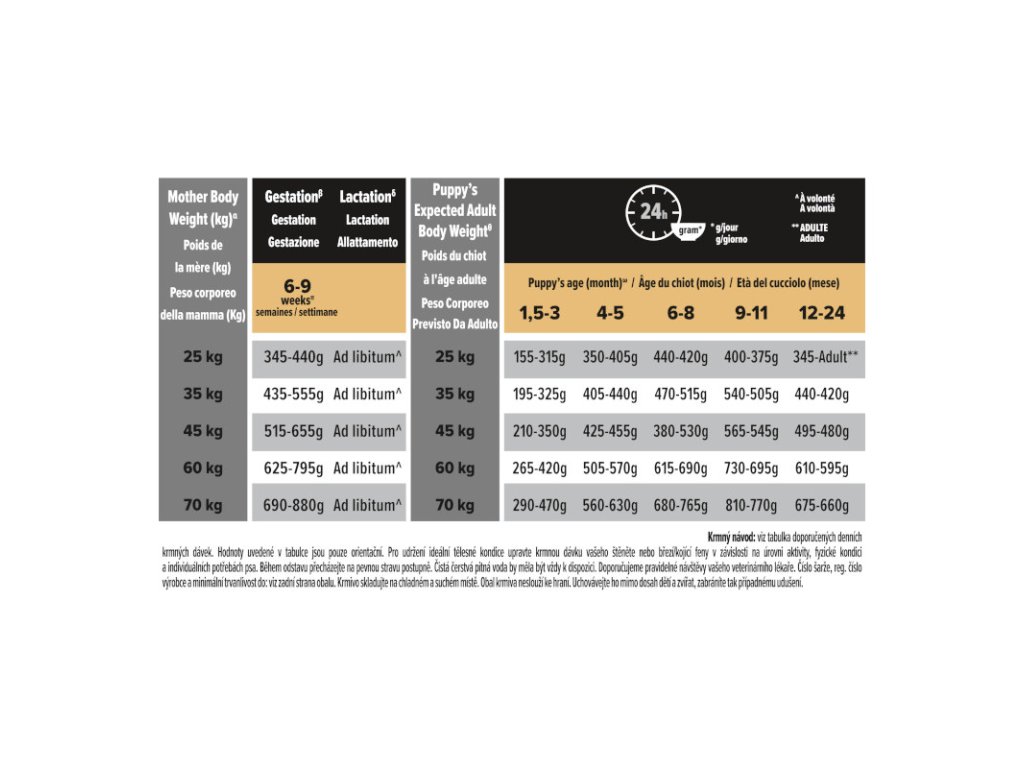 Krmný návod: viz tabulka doporučených denních krmných dávek. Hodnoty uvedené v tabulce jsou pouze orientační. Pro udržení ideální tělesné kondice upravte krmnou dávku vašeho štěněte nebo březí/kojící feny v závislosti na úrovni aktivity, fyzické kondici a individuálních potřebách psa. Během odstavu přecházejte na pevnou stravu postupně. Čistá čerstvá pitná voda by měla být vždy k dispozici. Doporučujeme pravidelné návštěvy vašeho veterinárního lékaře.