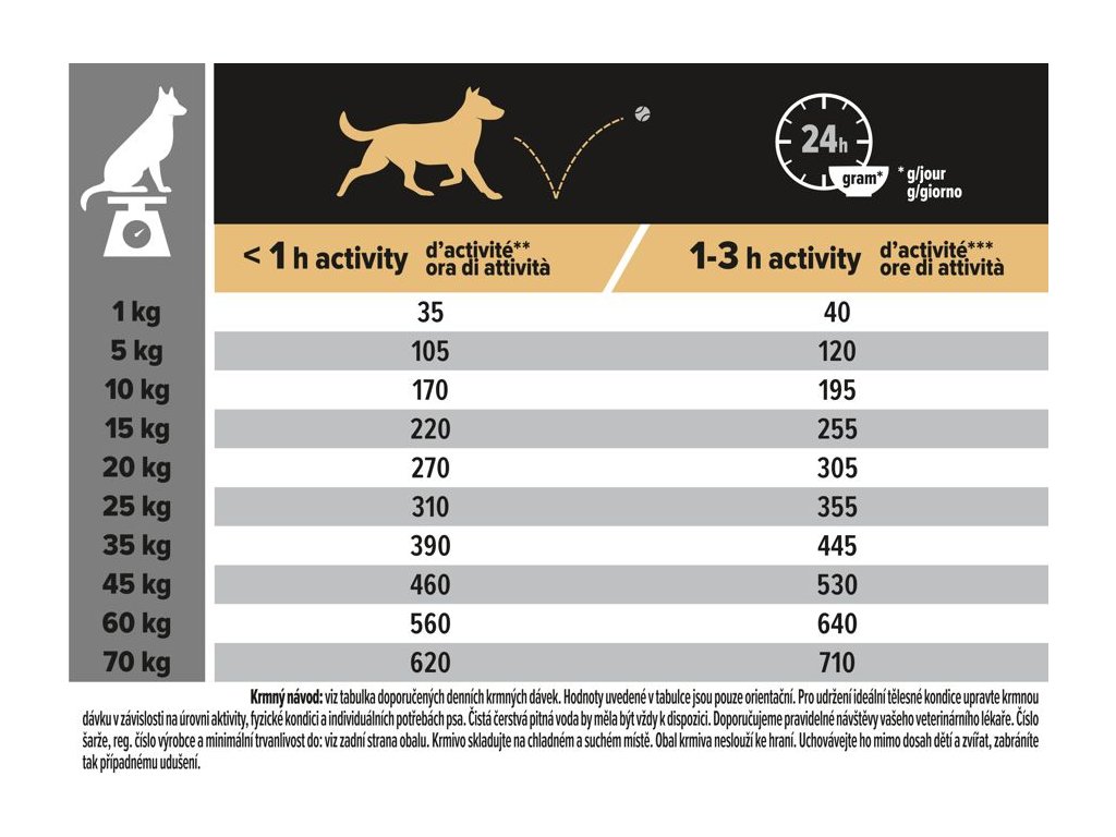 Krmný návod: viz tabulka doporučených denních krmných dávek. Hodnoty uvedené v tabulce jsou pouze orientační. Pro udržení ideální tělesné kondice upravte krmnou dávku v závislosti na úrovni aktivity, fyzické kondici a individuálních potřebách psa. Čistá čerstvá pitná voda by měla být vždy k dispozici. Doporučujeme pravidelné návštěvy vašeho veterinárního lékaře.
