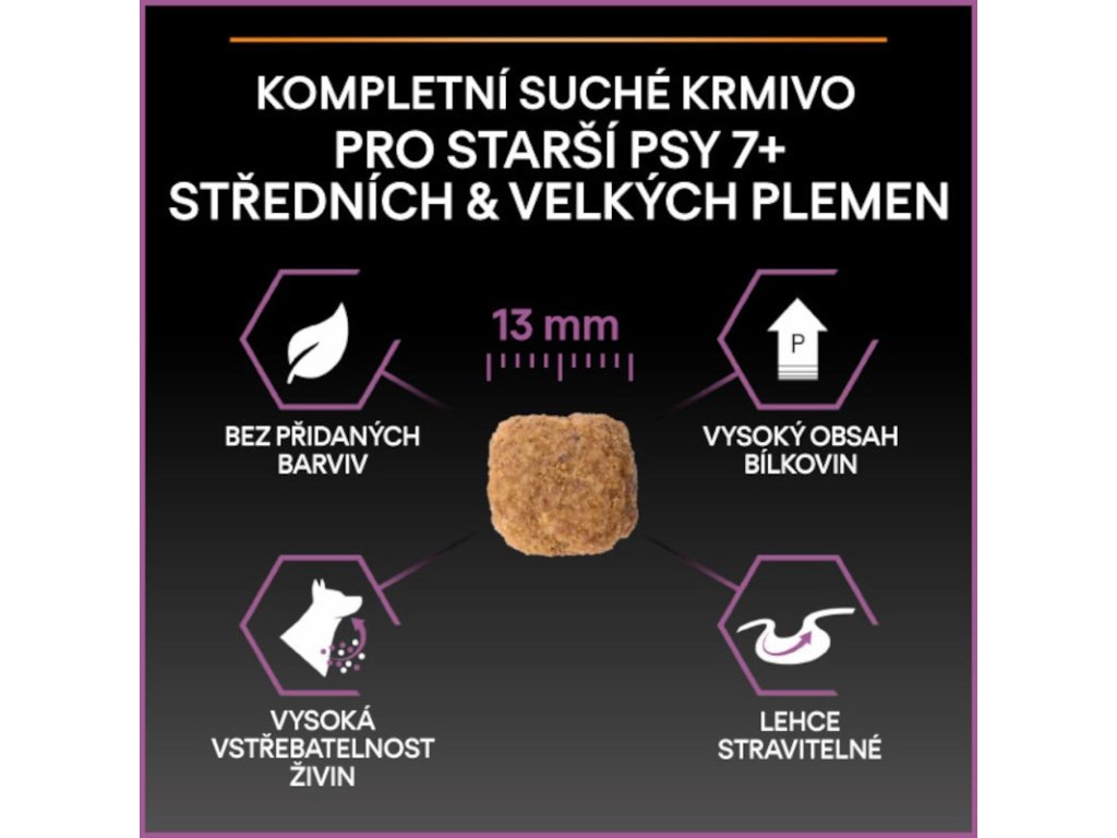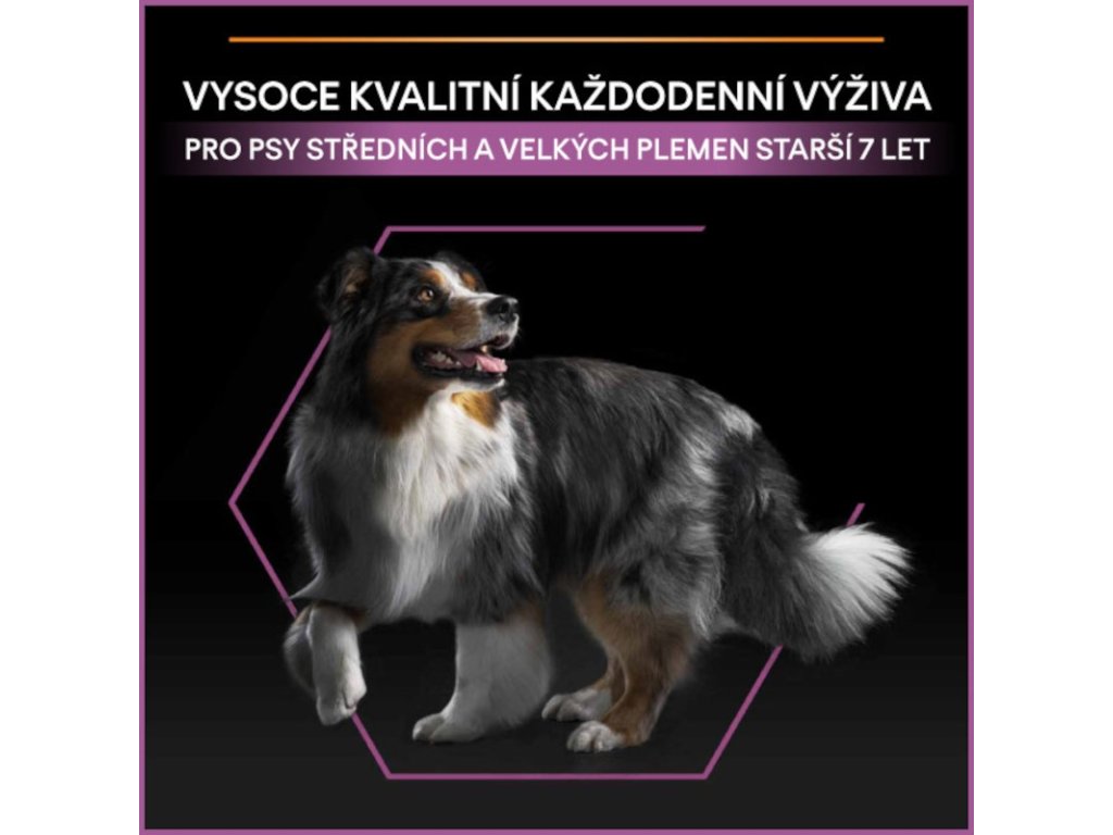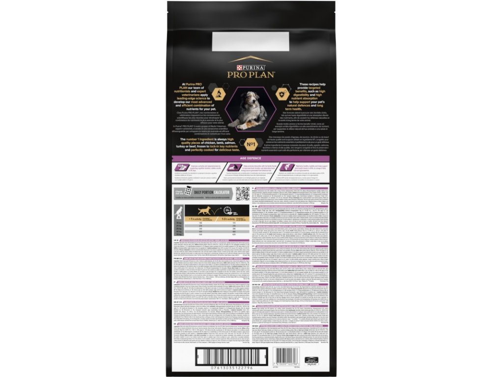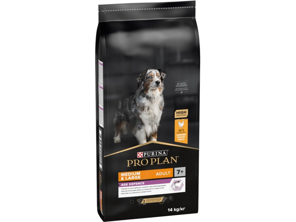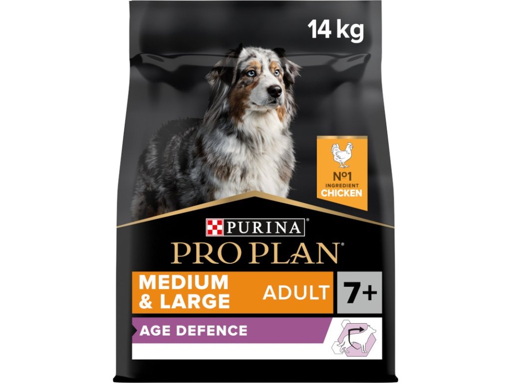 Krmivo Purina PRO PLAN® Age Defence MEDIUM&LARGE ADULT 7+ bylo vyvinuto pro starší psy středních a velkých plemen (s hmotností nad 10 kg). Granule obsahují vitamín D, minerální látky a specifické množství omega-3 mastných kyselin (0,3 %), které přispívají ke zdraví zubů a dásní. Krmivo má vysoký podíl kuřecího a upravený obsah bílkovin a tuků, což odpovídá nárokům na optimální výživu starších psů, jejichž věk překročil hranici 7 let.