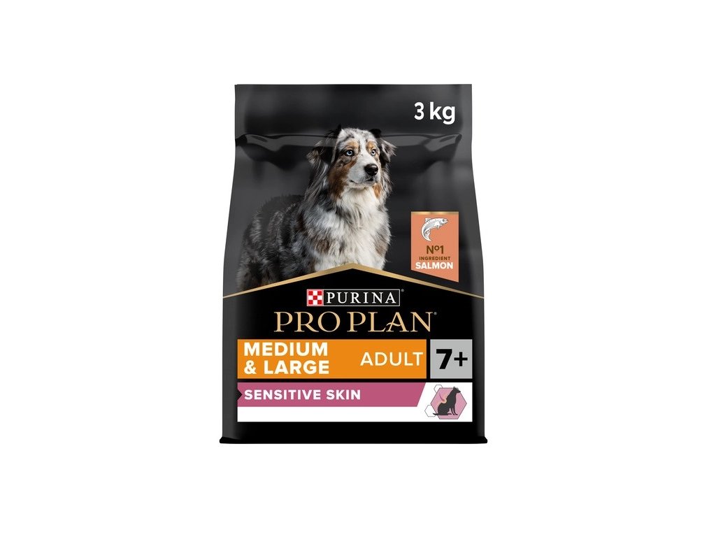 Receptura granulí Pro Plan Medium & Large Adult 7+ Sensitive Skin pro psy středních a velkých plemen starších 7 let (s hmotností nad 10 kg) obsahuje speciální kombinaci živin, která je ideální pro psy s citlivou kůží a pomáhá tak omezit kožní reakce spojené s přecitlivělostí na krmivo. Hlavním zdrojem bílkovin jsou kousky kvalitního lososa, který díky svému vysokému obsahu omega-3 mastných kyselin napomáhá udržovat zdravou kůži, lesklou srst a zdravé klouby. Krmivo je zcela bez pšenice. Optimální výživu pro zdravé stáří zajišťují vybrané zdroje bílkovin, vitamín D a minerální látky pro zdravé zuby a dásně. Vyvážený poměr bílkovin a tuků přispívá k udržení optimální váhy a každodennímu zdraví a pohodlí vašeho psa.