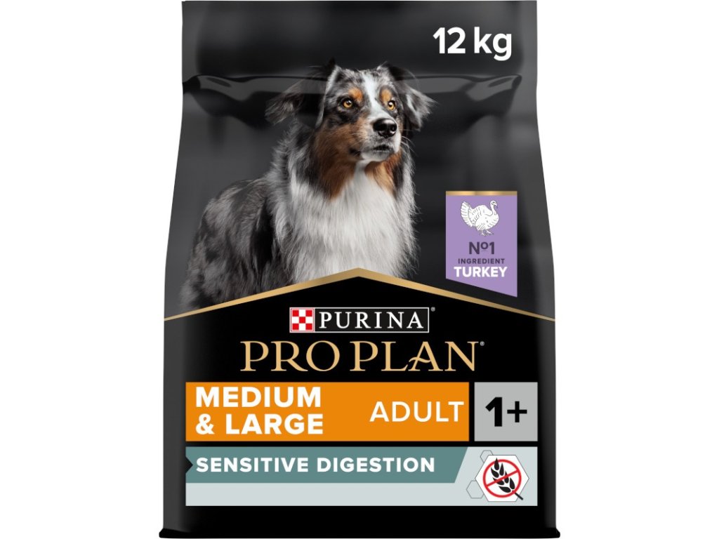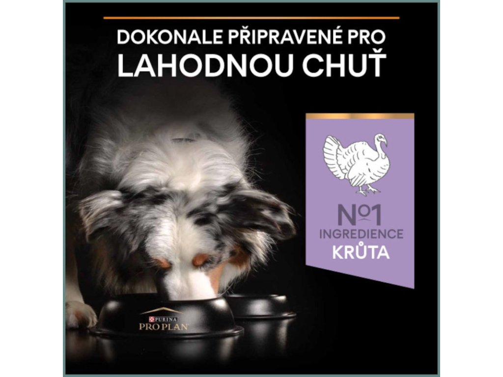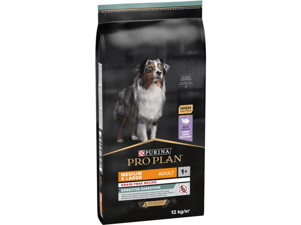 Krmivo Purina PRO PLAN® Sensitive Digestion Grain Free MEDIUM&LARGE ADULT bylo vyvinuto pro dospělé psy středních a velkých plemen (s hmotností nad 25 kg). Granule obsahují vitamín D a minerální látky, které přispívají ke zdraví zubů a dásní. Krmivo má vysoký podíl krůtího, a tak zajišťuje optimální výživu pro psy od 12 měsíců až do 7 let. Následně byste měli přejít na produkty z řady Age Defence. Objevte, jaký přínos má řada Sensitive Digestion Grain Free pro zdraví a pohodu vašeho psa.