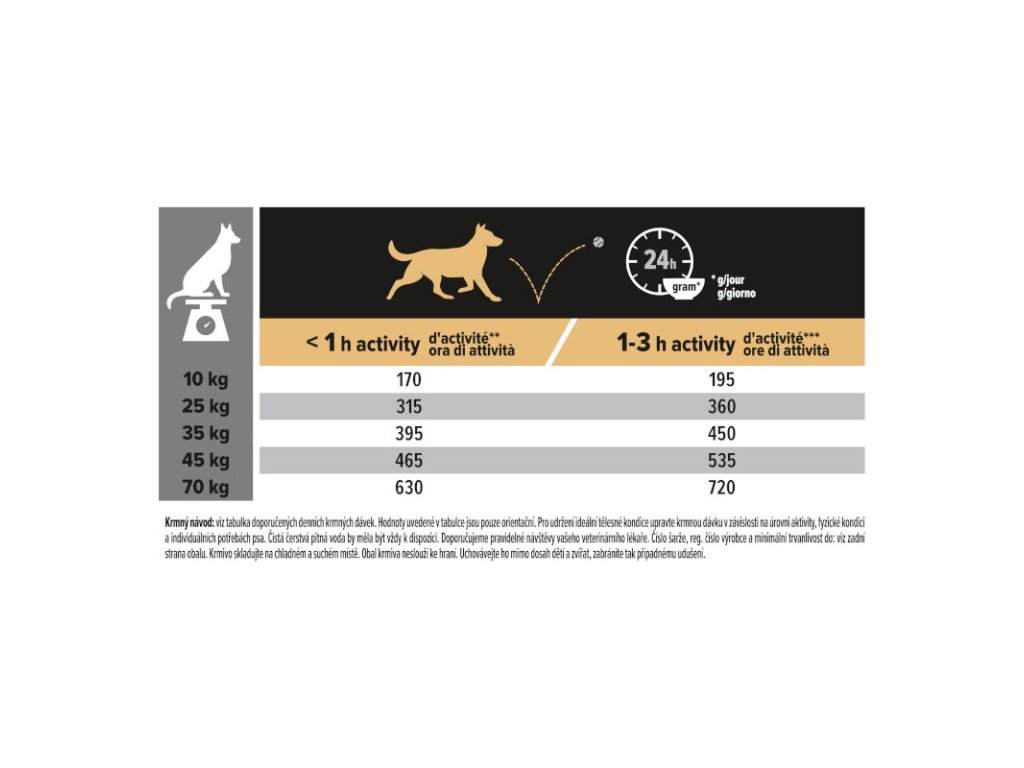 Krmný návod: viz tabulka doporučených denních krmných dávek. Hodnoty uvedené v tabulce jsou pouze orientační. Pro udržení ideální tělesné kondice upravte krmnou dávku v závislosti na úrovni aktivity, fyzické kondici a individuálních potřebách psa. Čistá čerstvá pitná voda by měla být vždy k dispozici. Doporučujeme pravidelné návštěvy vašeho veterinárního lékaře.