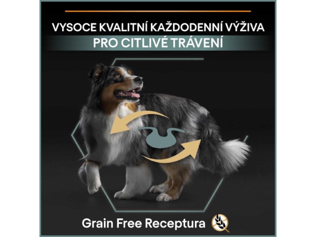 Přizpůsobte krmení citlivému zažívání vašeho psa. S PRO PLAN® Sensitive Digestion Grain Free se mu povede skutečně dobře. Obiloviny ve složení nenajdete, nahradili jsme je maniokem a dalšími ingrediencemi, abychom vám dopřáli ještě větší výběr produktů pro psy citlivým trávením.