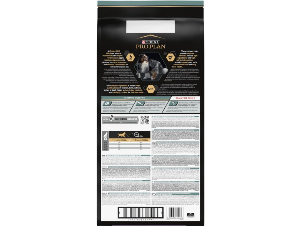 Hlavní složkou krmiva pro psy Purina PRO PLAN® Sensitive Digestion jsou kvalitní kousky krůtího a další vysoce stravitelné složky, které usnadňují trávicí proces. Tyto granule obsahují také prebiotika, u nichž bylo vědecky prokázáno, že zvyšují množství bifidobakterií, které zlepšují rovnováhu střevní mikroflóry, a bentonit (přírodní jíl), který podporuje správné vyprazdňování. Vysoký obsah bílkovin pomáhá udržovat silné svaly a ideální kondici.