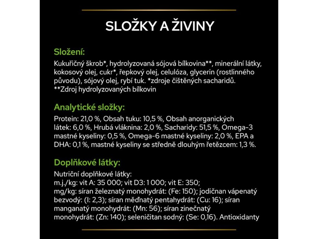 Složení: kukuřičný škrob, hydrolyzovaná sójová bílkovina, minerální látky, kokosový olej, cukr, řepkový olej, celulóza, glycerin (rostlinného původu), sójový olej, rybí tuk.