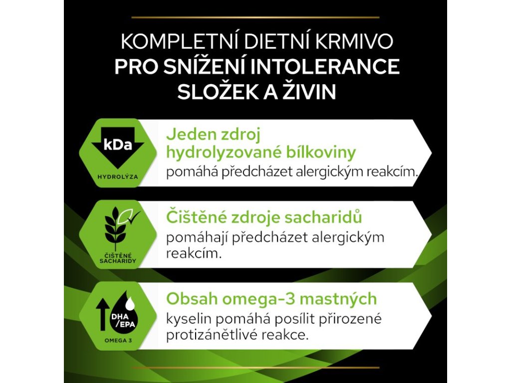 Kompletní dietní krmivo pro štěňata a dospělé psy určené k omezení intolerance určitých komponentů a živin. Krmivo s hydrolyzovanou bílkovinou a vybranými zdroji sacharidů.