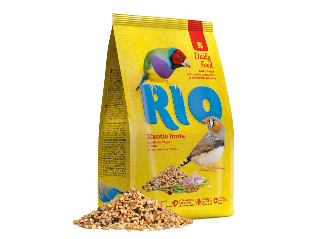 Krmný návod: Denní dávka krmiva RIO pro exoty je 5-10 g pro jednoho ptáčka.