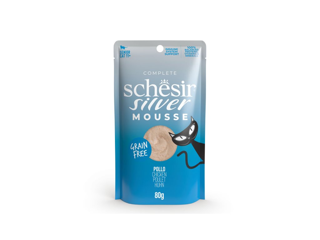 Od jedenáctého roku života mají kočky specifické nutriční potřeby spojené s jejich věkem, takže správná strava pro tyto potřeby je důležitá. Schesir Silver je řada kompletních a vyvážených receptur pro kočky ve věku 11 a více let, navržená pro podporu fungování jejich imunitního systému. Je založen na skutečné masové bílkovině v kombinaci s dalšími důležitými složkami. Neobsahuje žádné obiloviny.
